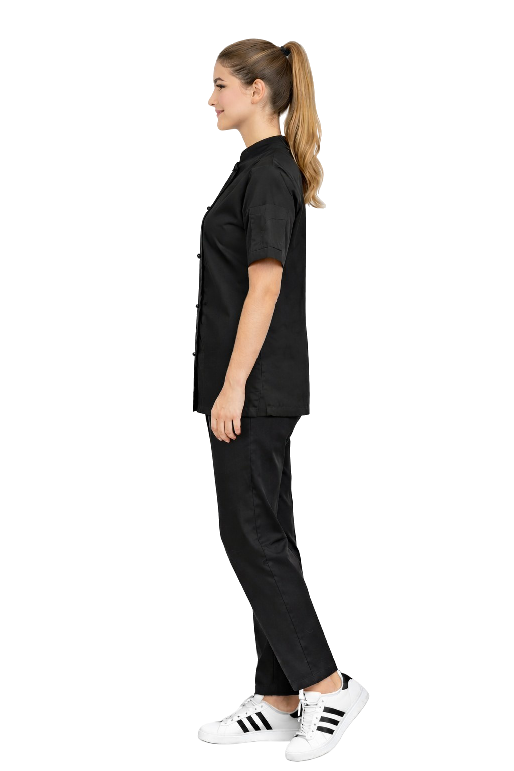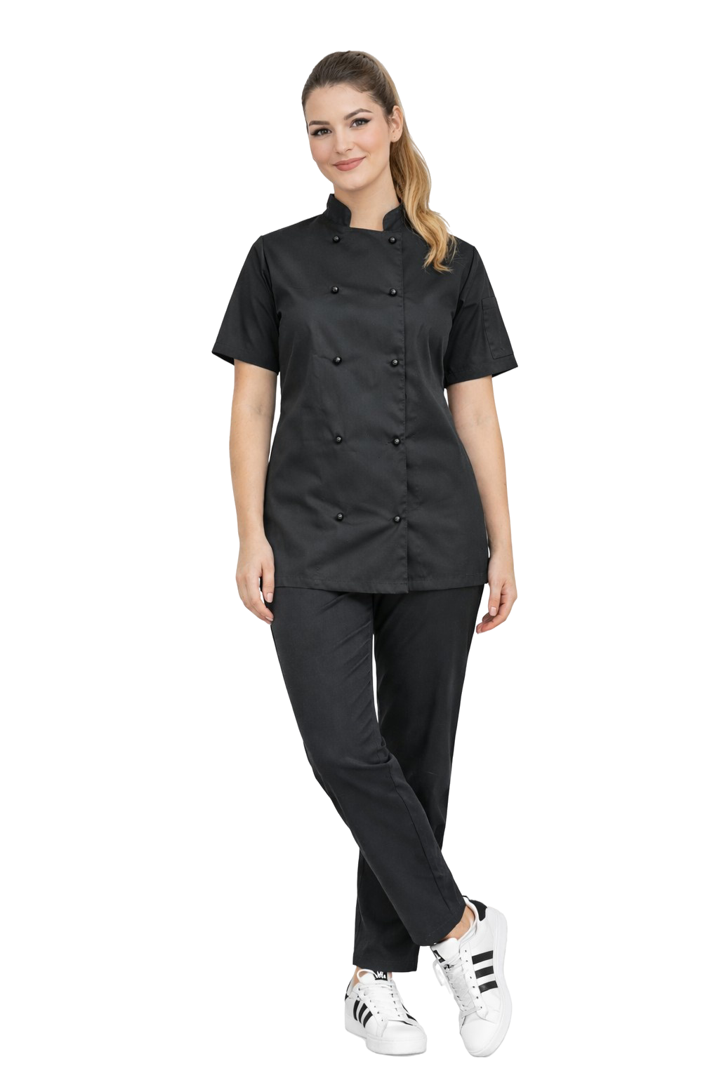 Naisterõivaste komplekt, mis koosneb taljes kittelist, millel on nööpkinnitusega, ning mugavatest kokapükstest, on ideaalne lahendus gastronoomiavaldkonnas töötavatele naistele. Komplekt ühendab professionaalse välimuse, materjalide vastupidavuse ja mugavuse pikkade töötundide ajal.