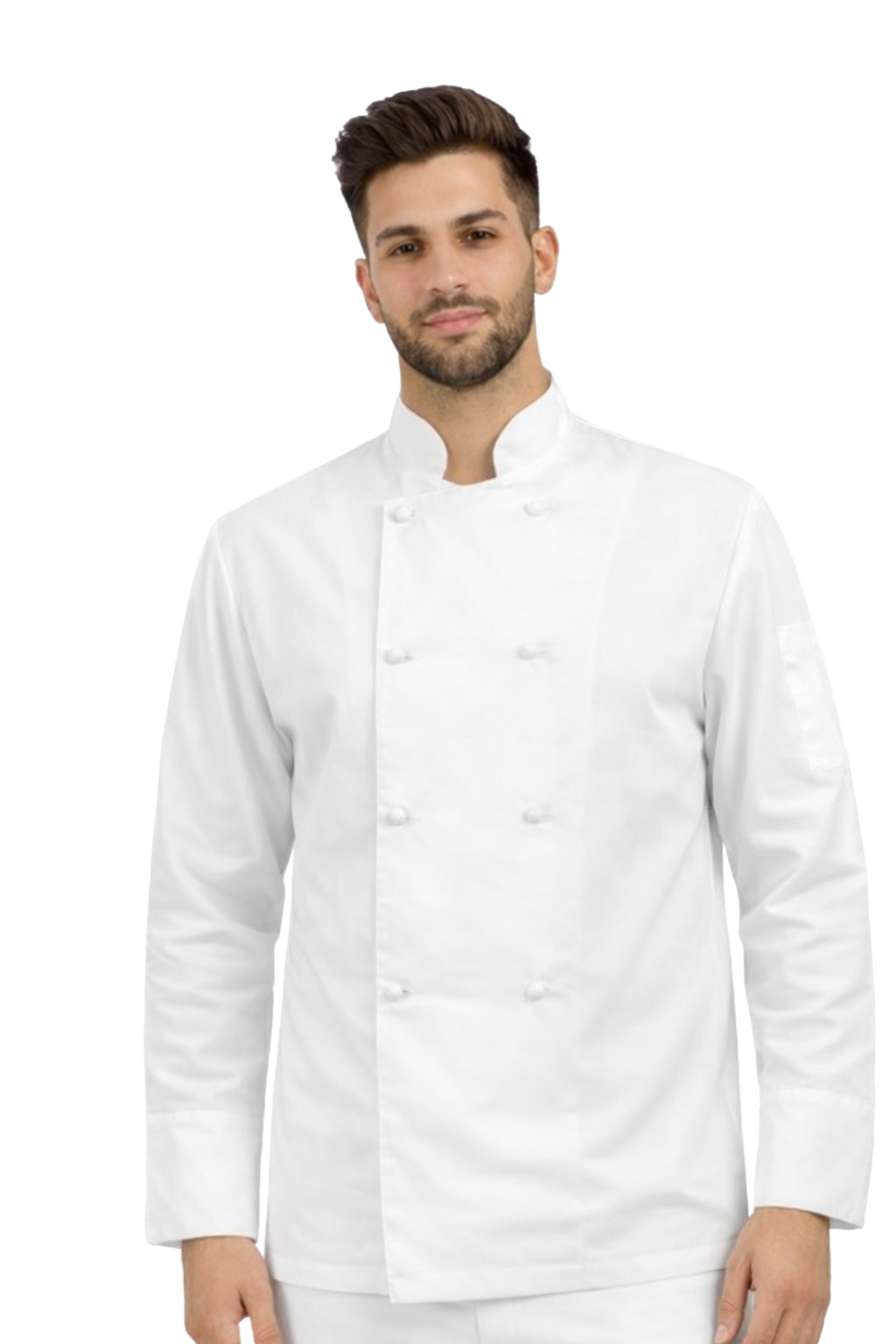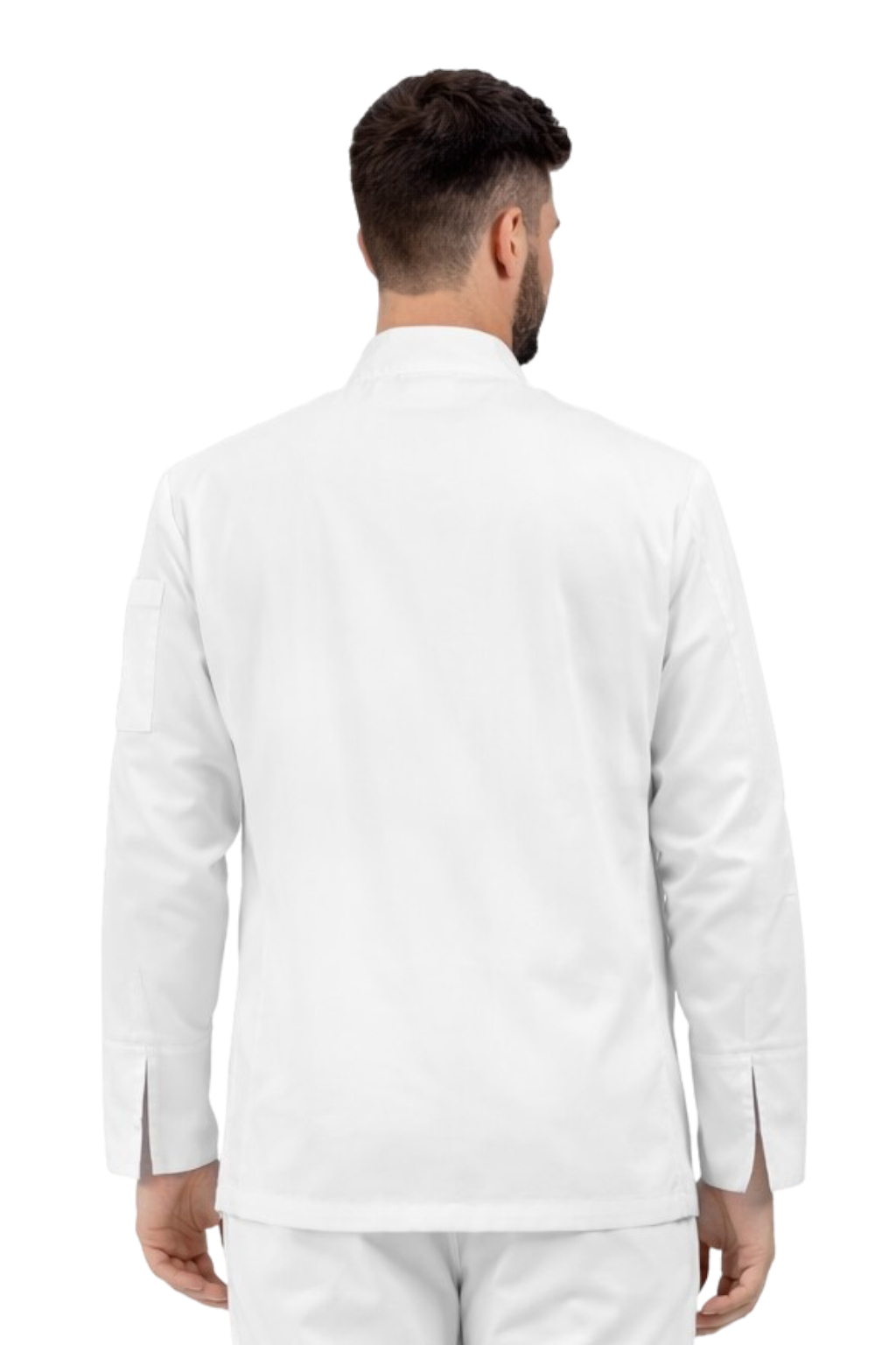 Valge meeste kokakittel valgete nööpidega – gastronoomiline kitel, pika varrukaga